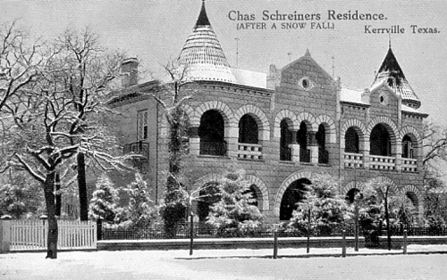Early postcard showing Charles Schreiner’s home on Earl Garrett Street, after a snowfall.
